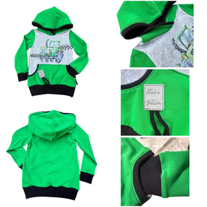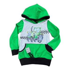 - Design: Grüner Hoodie mit Kapuze, Fronttasche und detailreichem Traktordruck