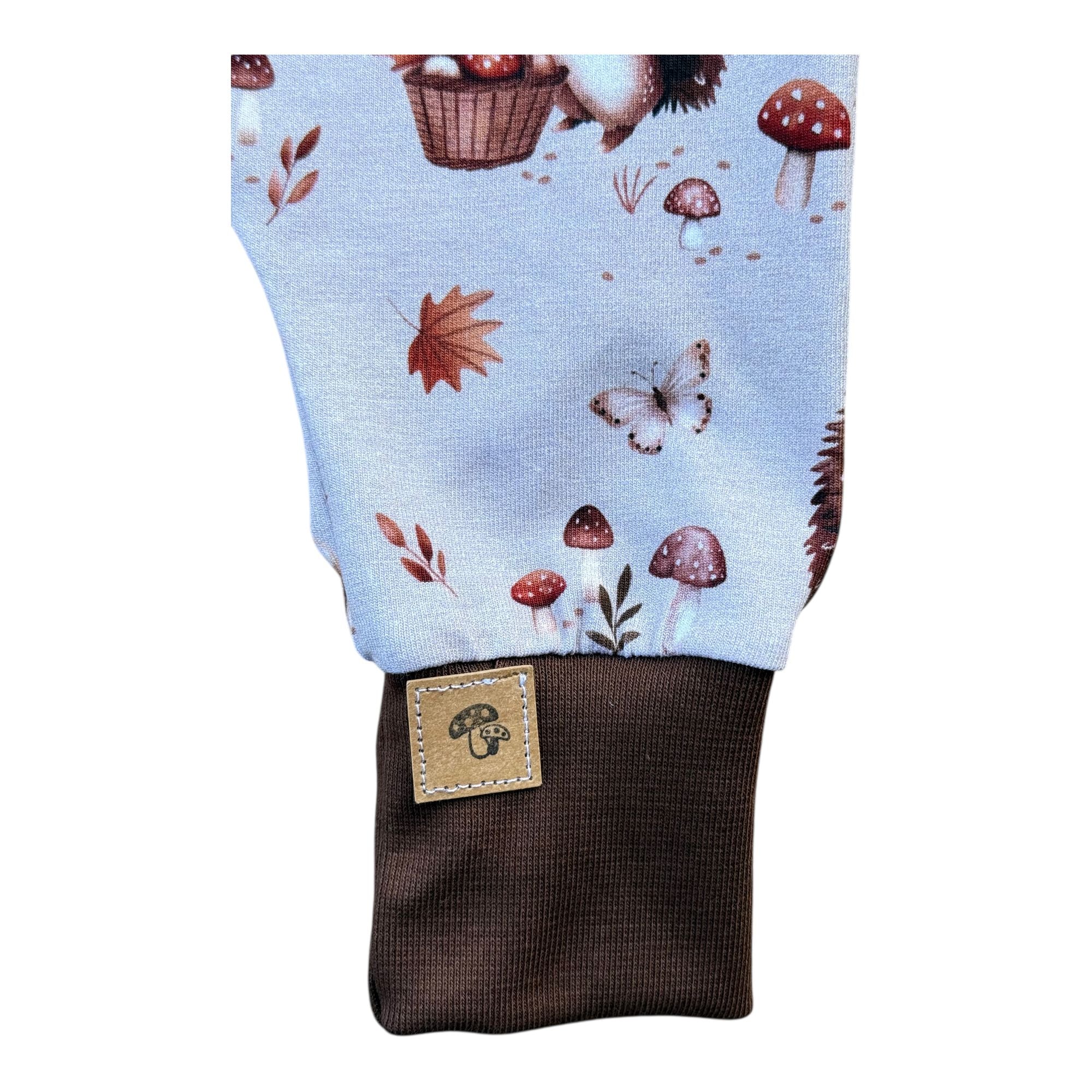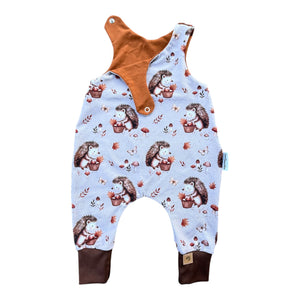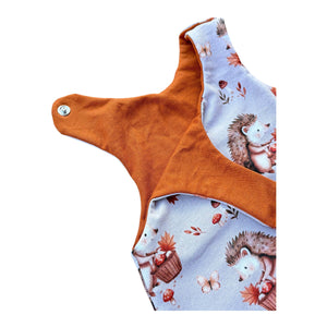 Dieser handgemachte Baby-Strampler mit süßem Igel-Motiv im herbstlichen Design ist ein echter Hingucker. Die warmen Naturtöne und das verspielte Muster machen ihn zu einem besonderen Kleidungsstück für kleine Entdecker 🍂